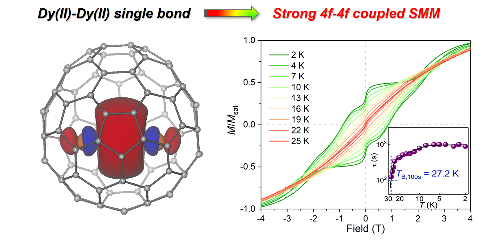 由全碳原子组成的封闭笼状富勒烯分子,为稳定上述特殊的镧系金属共价键提供了可能,所得到的内嵌金属富勒烯SMM具有化学和热稳定性高、可升华、分子和电子结构易于调控等特点。鉴于此,杨上峰教授团队通过真空电弧放电法合成了首例含有Dy-Dy共价键(键长仅为3.61 Å)的双金属富勒烯Dy2@C82。这一特殊成键性质导致两个Dy离子之间产生很强的反铁磁耦合作用(磁交换能垒为33.9 K),从而有效抑制了量子隧穿效应。Dy2@C82在25 K以下均能展现出SMM特征的磁滞现象,其弛豫时间100秒时对应的阻塞温度(TB,100s)达27.2K,为目前报道的所有通过4f电子直接耦合(不含单电子金属-金属键)的多核单分子磁体中的最高值。这一发现不仅展示了内嵌金属富勒烯在单分子磁体领域的优势,也为研究镧系金属的特殊成键性质提供了重要的科学模型。