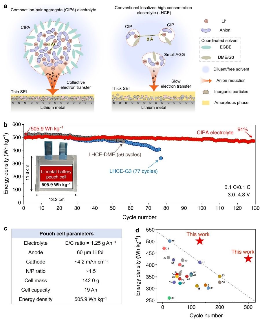 近日,中国科学技术大学化学与材料科学学院焦淑红教授团队,联合北京大学徐东升教授、中国科学院物理研究所王雪锋研究员和苏州大学程涛教授团队,在高能量锂金属电池领域取得突破性进展。研究人员通过调控电解液在介观尺度下的锂离子溶剂化结构,设计了一种紧密离子对聚集体(CIPA)电解液,从而实现了500Wh kg−1锂金属电池的稳定运行。相关成果以“Towards long-life 500 Wh kg−1lithium metal pouch cells via compact ion-pair aggregate electrolytes”为题,于7月8日发表在Nature Energy杂志上。
