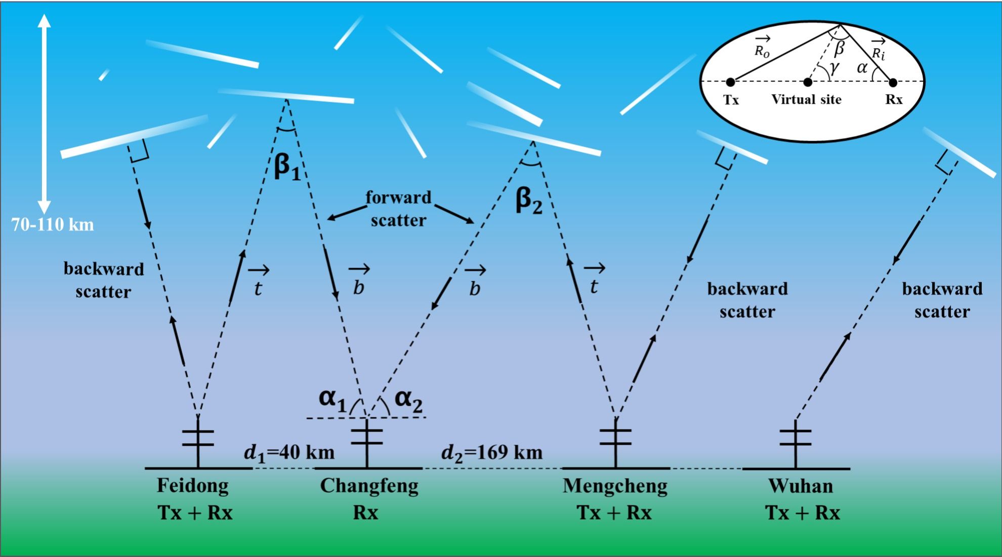 图1. 中国中东部多站流星雷达观测网工作示意图(从左至右:肥东、长丰、蒙城、武汉站)。