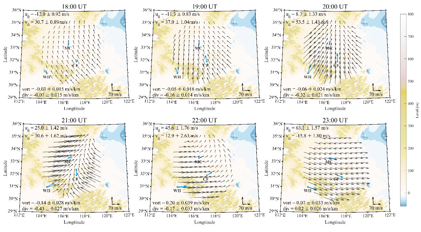图2. 多站流星雷达系统观测的中东部地区中间层-低热层大气二维水平风场。