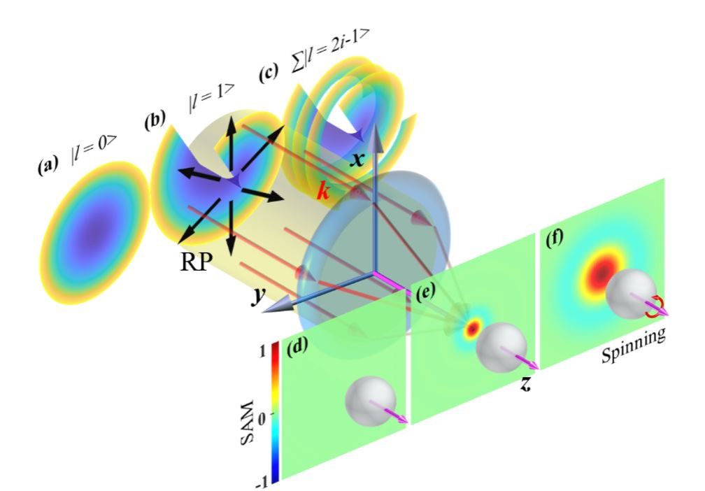 由于自旋-轨道相互作用,线偏振或径向偏振光束的两个自旋分量在紧聚焦条件下将产生横向分离,即为一种光学自旋霍尔效应[Fig. 1(a, b)]。然而,这种自旋劈裂的间距只有亚波长量级,在与微粒相互作用时无法有效传递自旋角动量,不能驱动微粒自旋[Fig. 1(d,e)]。研究团队巧妙地运用光学轨道霍尔效应来调控聚焦场自旋角动量密度分布,通过在入射径向偏振光场引入轨道角动量叠加态[Fig. 1(c)],有效调控两个自旋分量的径向间距,实现了聚焦场自旋角动量对微观粒子的局域传递,最终实现了粒子的可控自转操控[Fig. 1(f)]。