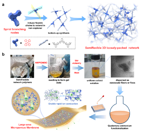 碱性膜在化工分离、二氧化碳转化、电化学合成氨、电解水制氢、能量转换和存储方面有广泛的应用。然而仅依靠传统的微相分离调控方法难以对离子通道的构建进行精确控制,导致电导率,选择性和稳定性之间的权衡问题。近年来大量的研究表明,通过改变聚合物骨架的刚性和拓扑结构,可以对高分子链间的自由体积进行调控,进而在膜中构建具有明确尺寸的微孔离子传输通道。