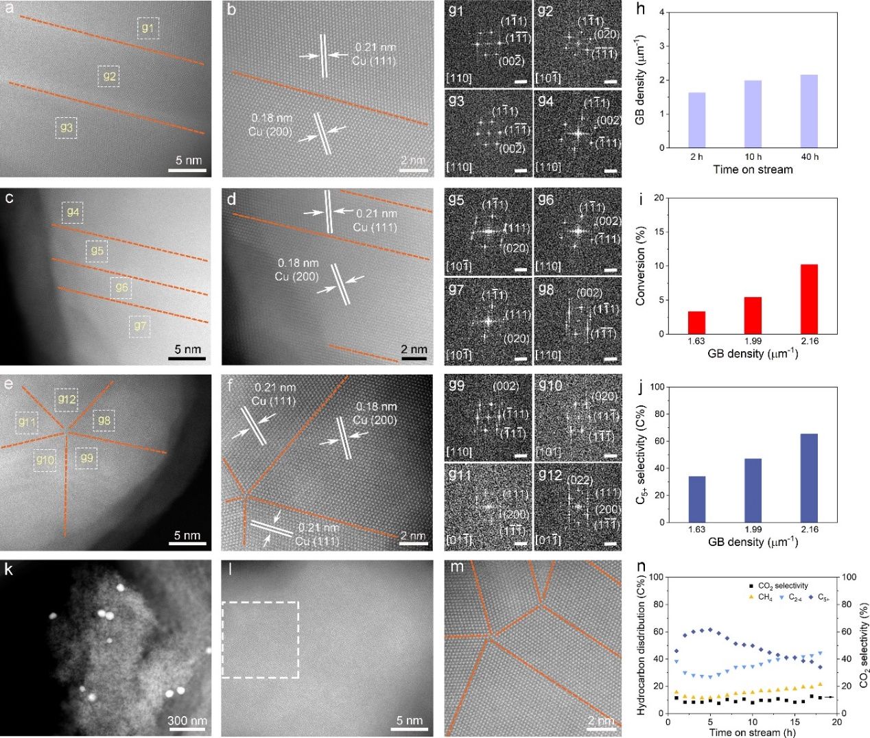 为了研究催化性能存在活化期的原因,研究人员收集了反应不同阶段(图1a中的2小时,10小时和40小时)的样品进行结构演变表征。通过球差电镜发现在合成气氛围下反应2小时后,催化剂通过小颗粒的相互聚集,形成了具有晶界的较大米颗粒(图2a和b)。随着反应时间的延长,颗粒逐渐变大,晶界位点也逐渐增多(图2c-f)。借助快速傅里叶变换(FFT) 图像发现界面处存在不同晶面(图2g1-g12)。通过统计计算,研究人员发现晶界密度和和C5+选择性呈正相关(图 2h-j)。为了排除分子筛的影响,确认晶界的C-C偶联作用,研究人员将可控合成得到的Cu纳米颗粒负载到到惰性SiO2载体上,同样发现具有较高的C5+选择性(图2n)。以上结果表明Cu晶界位点在C-C偶联中具有的决定性作用。