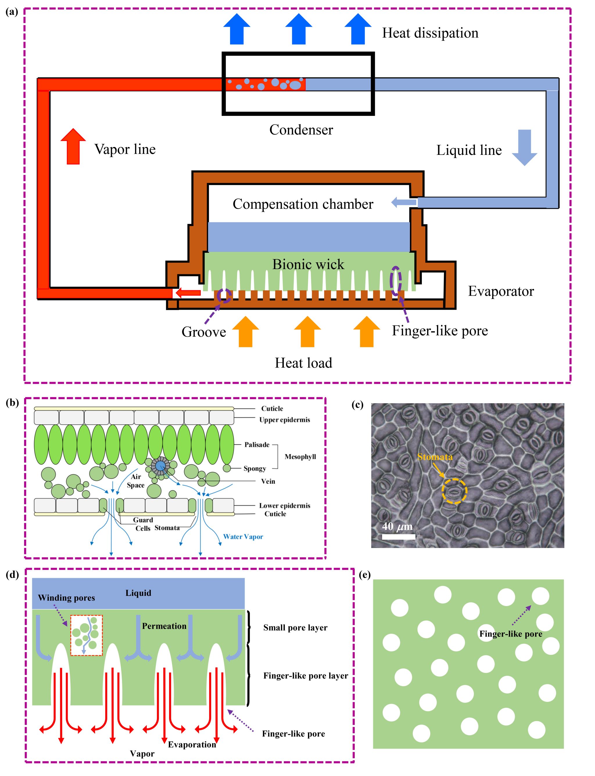 为解决这一难题,叶宏教授团队从植物叶片的气孔结构中获得灵感,通过相转化流延法成功开发了一种具有指状孔结构的氧化铝陶瓷仿生毛细芯。该仿生毛细芯内的指状孔具有与植物叶片气孔相似的直孔结构,有效增大了气液界面面积,能及时排出气态工质,从而减小了传质阻力。同时,指状孔周围的微米级孔隙为气液蒸发界面的液体补充提供了足够的毛细力。通过LHP的启动和运行实验,证实了仿生毛细芯优越的传热传质性能。这项工作不仅有效解决了提高毛细力与降低流动阻力之间的矛盾,而且为高功率密度电子芯片散热提供了新颖的解决思路,在航空、航天以及微电子领域的高效热管理中展现出潜在的应用价值。