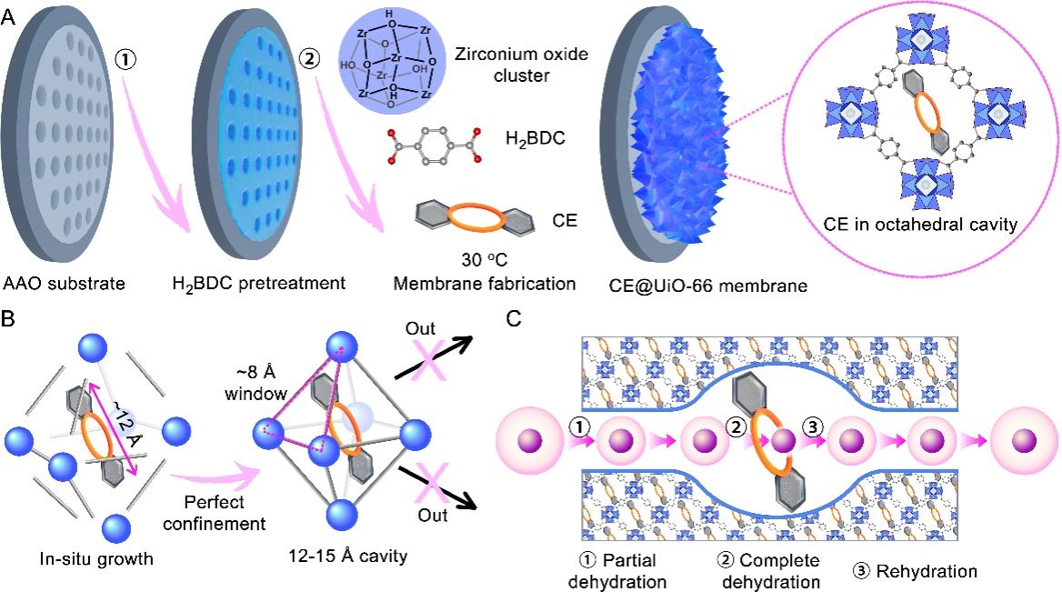 近日,中国科学技术大学徐铜文教授/李兴亚副研究员等在限域离子分离膜方面取得突破性进展,他们提出离子全脱水的概念,设计制备了MOF限域冠醚膜,解决了复杂体系中离子精准分离难题。研究成果以题为“Perfect confinement of crown ethers in MOF membrane for complete dehydration and fast transport of monovalent ions”发表在国际著名期刊Science Advances上(Sci. Adv. 10, eadn0944, 2024)。