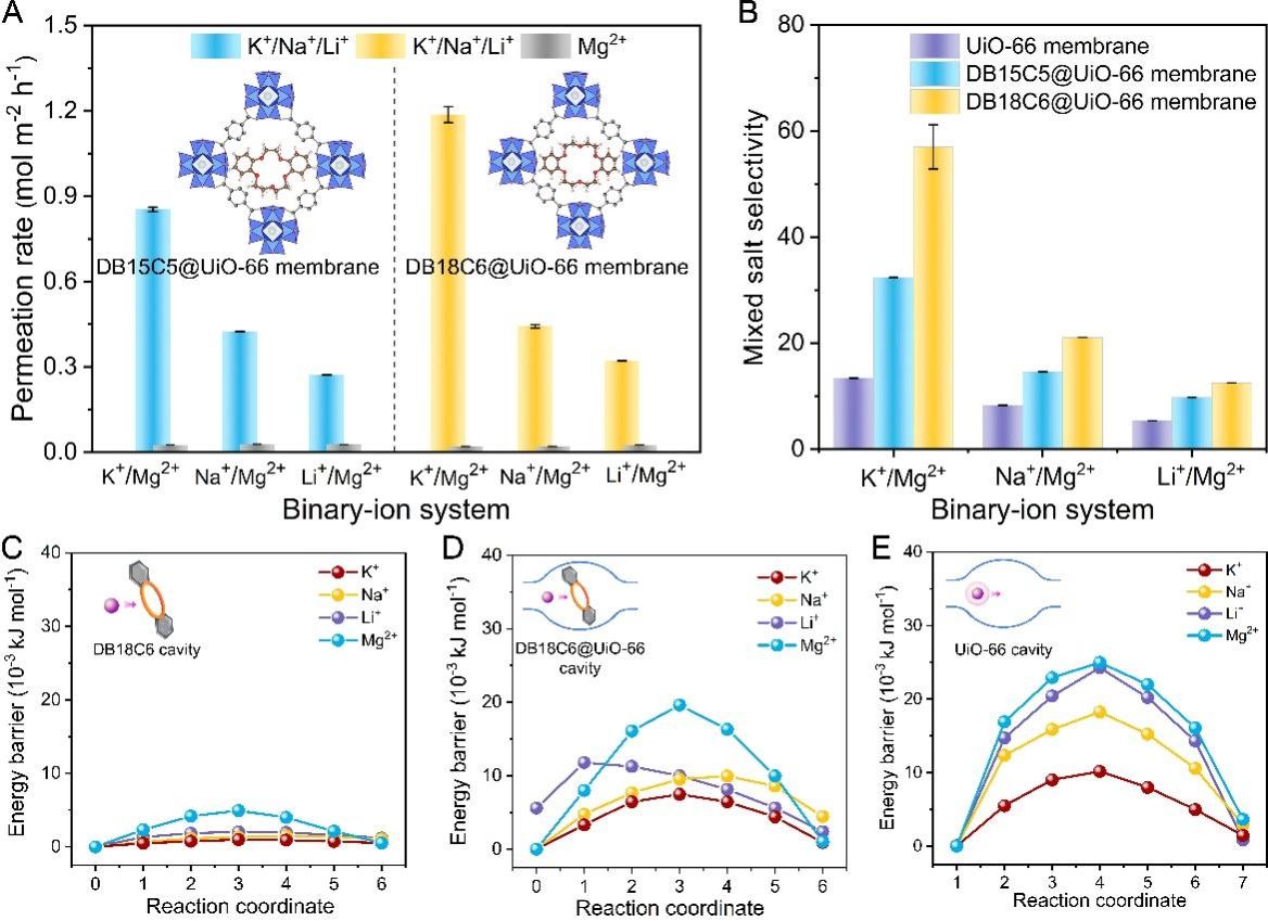 团队前期研究成果表明埃尺度膜通道有助于离子发生部分脱水,促进离子传递与筛分(J. Am. Chem. Soc.,2022, 144, 23, 10220-10229)。为了进一步提升一价离子通量和选择性,本工作在温和条件下(30 ℃)原位生长MOF限域冠醚(CE@UiO-66)膜,利用UiO-66的窗口-空腔结构实现对冠醚分子的“完美限域”(图1)。该条件下制备的UiO-66具有~8 Å窗口和~12-15 Å空腔,基于尺寸匹配效应,可以限域分子尺寸为~12 Å的二苯并-15-冠醚-5(DB15C5)或二苯并-18-冠醚-6(DB18C6)。与原始的UiO-66膜相比,CE@UiO-66膜表现出更高的一价离子渗透速率和选择性,这是由于UiO-66窗口尺寸筛分和冠醚相互作用筛选的协同作用使得一价离子发生完全脱水。在浓差驱动的二元离子分离体系中,一价阳离子的通量(如K+)以及一价/二价阳离子的选择性(如K+/Mg2+)分别在0.9 ~ 1.2 mol m2h-1和30 ~ 60 之间(图2)。第一性原理计算和分子动力学模拟表明,一价离子在通过DB18C6@UiO-66空腔时完全脱水,促使一价离子以较低能垒快速传递(传递能垒:K+< Na+<Li+<Mg2+),最终离子跨膜速率为:K+> Na+> Li+> Mg2+。MOF限域冠醚策略可结合膜的孔径筛分与相互作用筛选效应,同步提升离子通量和选择性,为复杂体系下离子精准分离膜的构筑提供了理论指导。