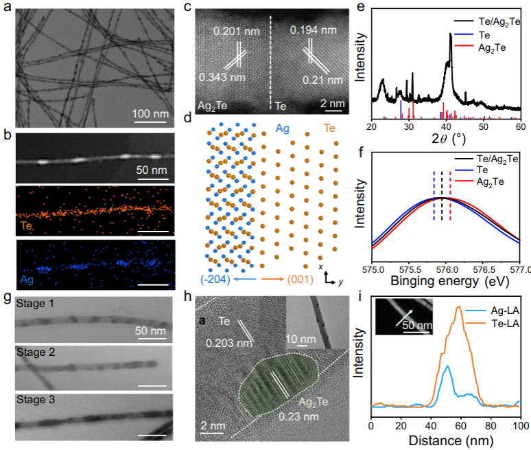 图1. Te/Ag2Te一维分段异质纳米结构的形貌和结构表征。