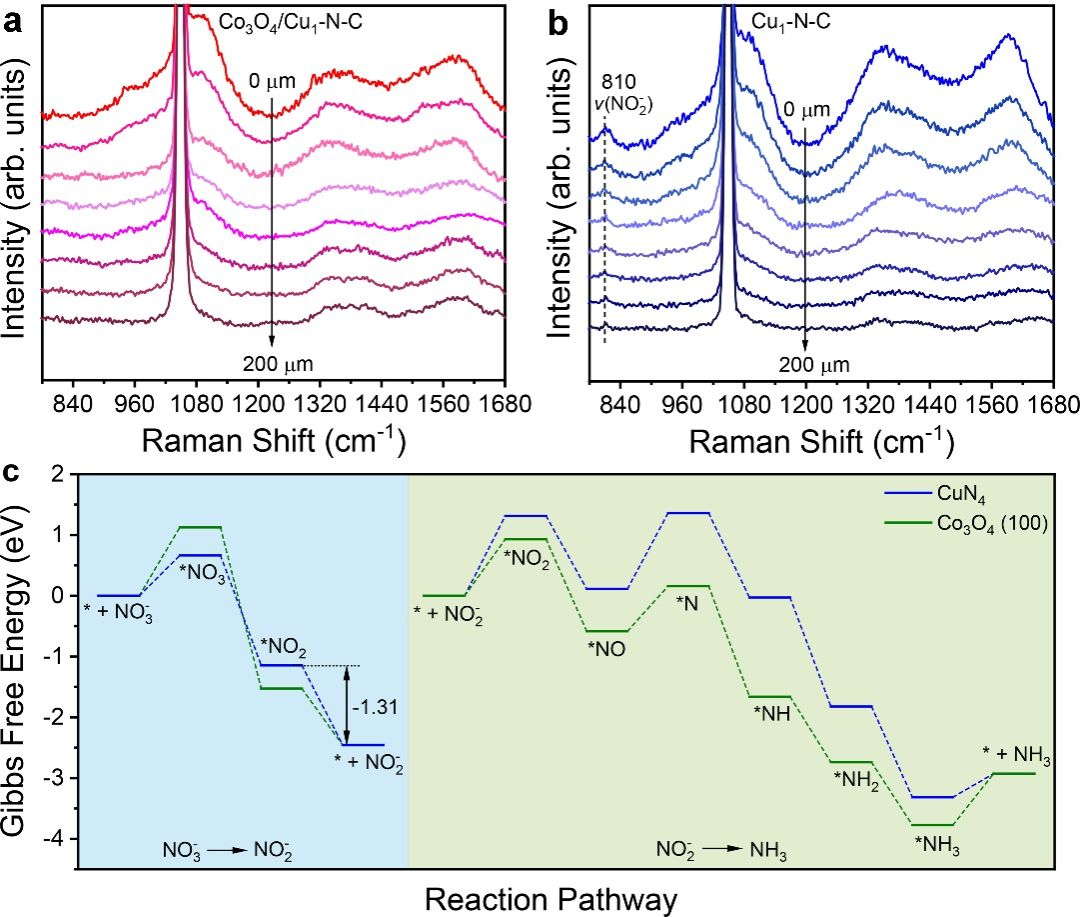 在本工作中,研究人员将Co3O4纳米片均匀负载于Cu单原子催化剂表面(Co3O4/Cu1-N-C),电化学测试结果表明,Co3O4/Cu1-N-C在NO3-电还原反应中的产氨速率可达114.0 mgNH3h-1cm-2,相比于单独的Cu1-N-C和Co3O4纳米片分别提高了2.2倍和3.6倍。结合电化学原位拉曼和理论计算,Cu单原子位点促进了NO3-到NO2-的转化,而邻近的Co3O4可增强对NO2-的吸附,从而促进了NO3-和NO2-的顺序电还原,极大地提高了产氨速率。