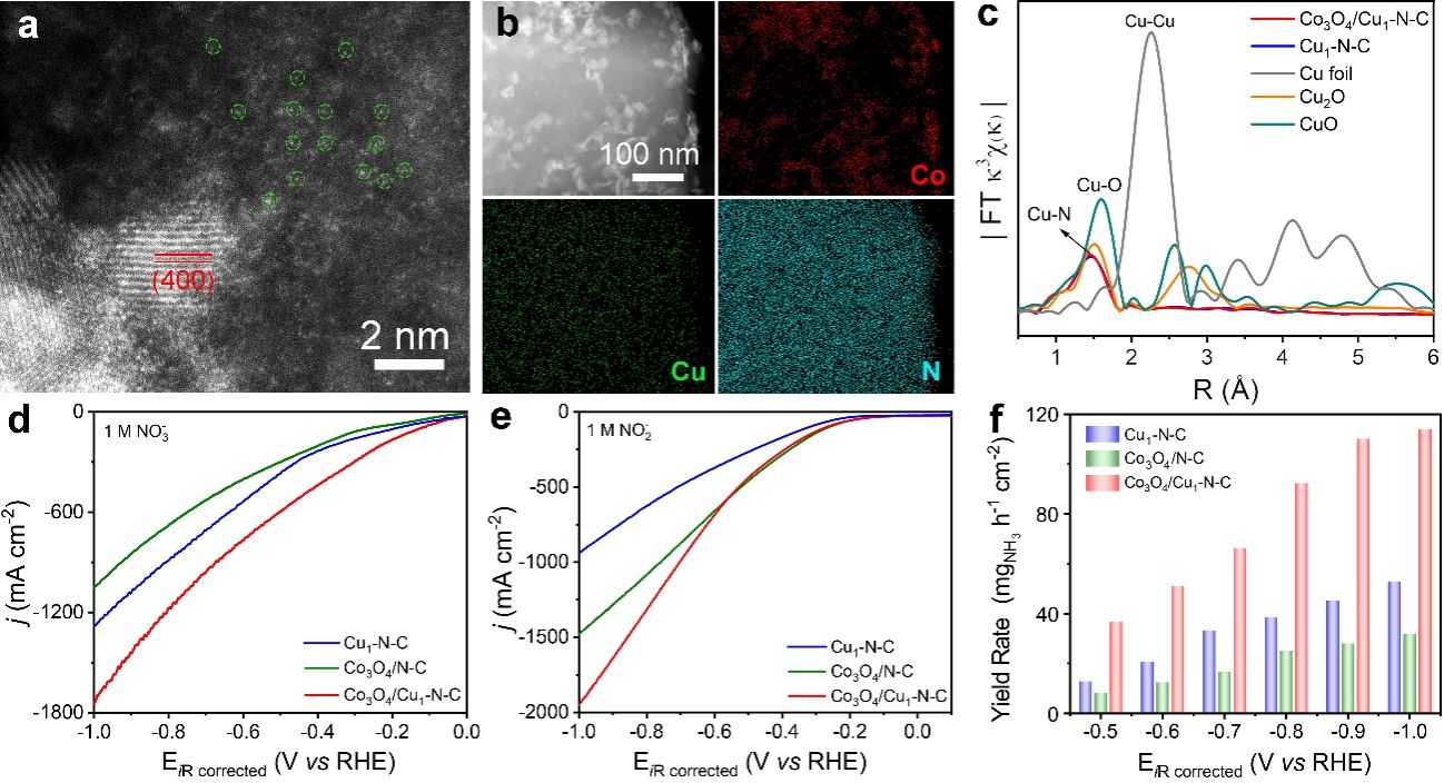 图1. Co3O4/Cu1-N-C的(a)球差校正HAADF-STEM图、(b)元素分布图和(c)Cu K边X射线吸收近边谱。催化剂(d)在NO3-电解液中的LSV曲线、(e)在NO2-电解液中的LSV曲线和(f)产氨速率。