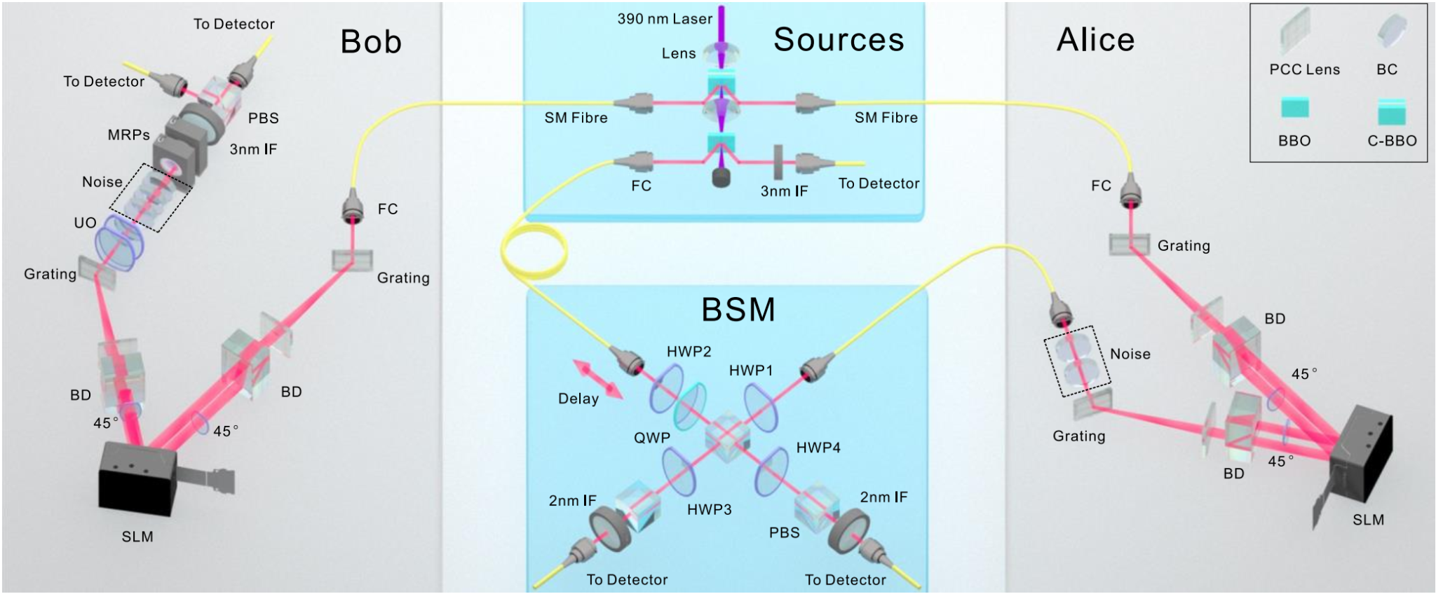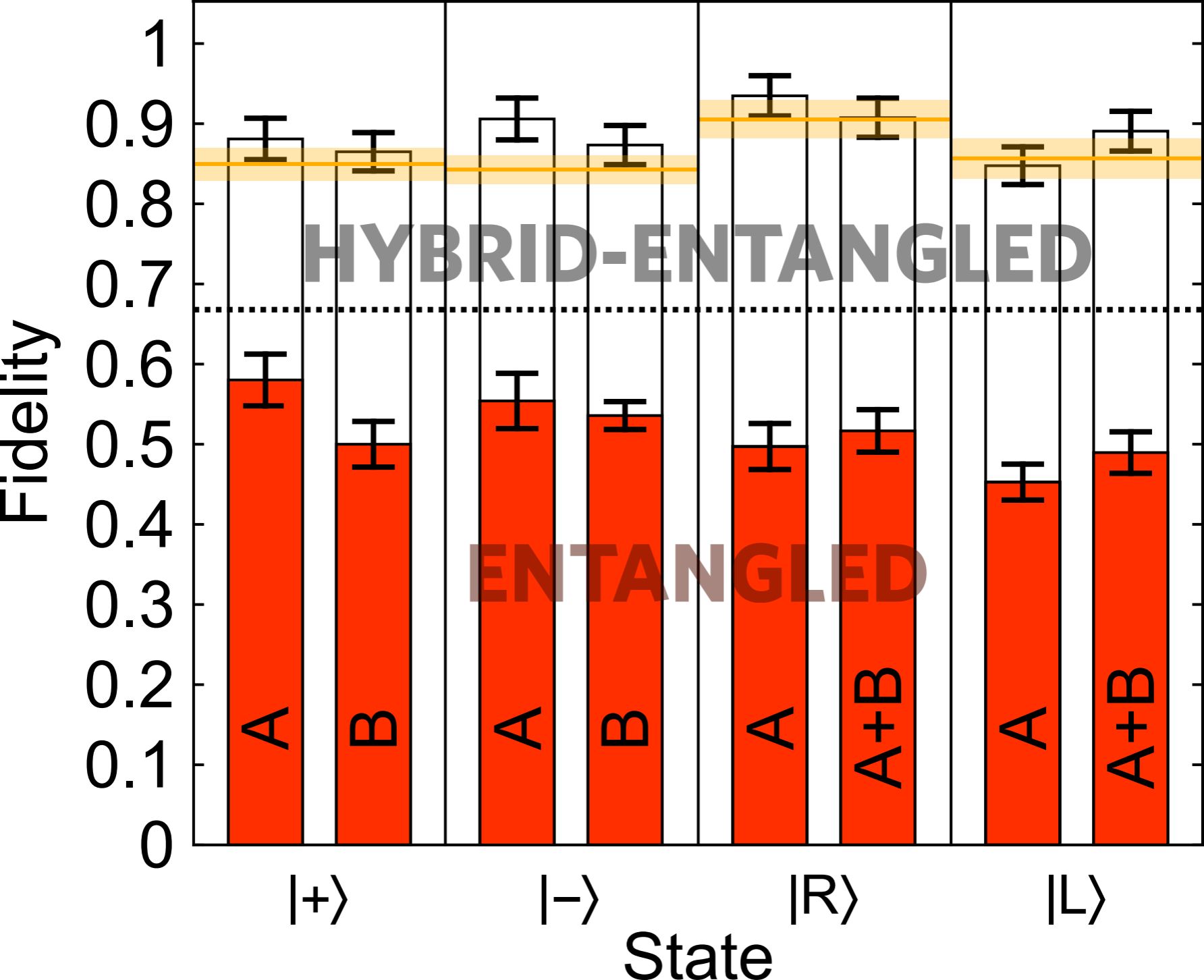 研究团队首先证明了,通过对单量子系统的环境进行特定相位调制,可以完全逆转开放量子系统演化中的相位退相干,并且该方法可以被推广到任意多体系统中。然后以光子的偏振做为量子系统,光子的频率做为噪声环境进行实验。基于完全可控相位退相干量子模拟器,在环境中加载特定相位调制,从而制备出双光子偏振-频率混合纠缠初态,然后把两个光子分发给用户Alice和Bob。Alice端进行退相干演化,再与待传递的量子态做贝尔测量,接着在Bob端进行退相干演化,最终通过经典通信对得到的量子比特做相应幺正操作得到被传递的量子态(图1和图2),测得的保真度接近90%(图3)。由于此过程中双光子的偏振态从未违背贝尔不等式,本实验是基于隐藏量子非局域性实现了量子隐形传态。总之,本成果提供了一种区别于动力学解耦(Dynamical Decoupling)和无退相干子空间(Decoherence-Free Subspaces)的克服环境噪声的新方法,并对深入理解量子非局域性有重要意义。