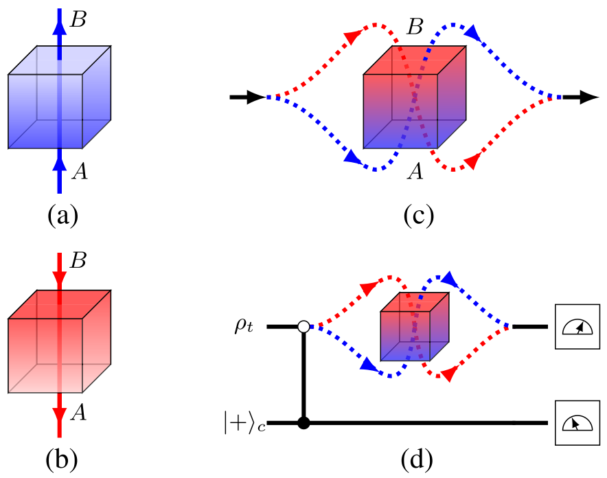 (a)量子装置A端输入B端输出,演化方向从A到B;(b)演化方向从B到A;(c)两种演化方向相干叠加;(d)引入辅助比特进行实验实现。