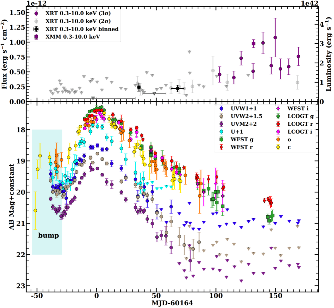图 2 AT 2023lli的多波段光变曲线。紫外和光学上升期间存在着非常强的“鼓包”,X射线在紫外和光学光变衰减的过程被探测到,但是呈现出“间歇性”的辐射。