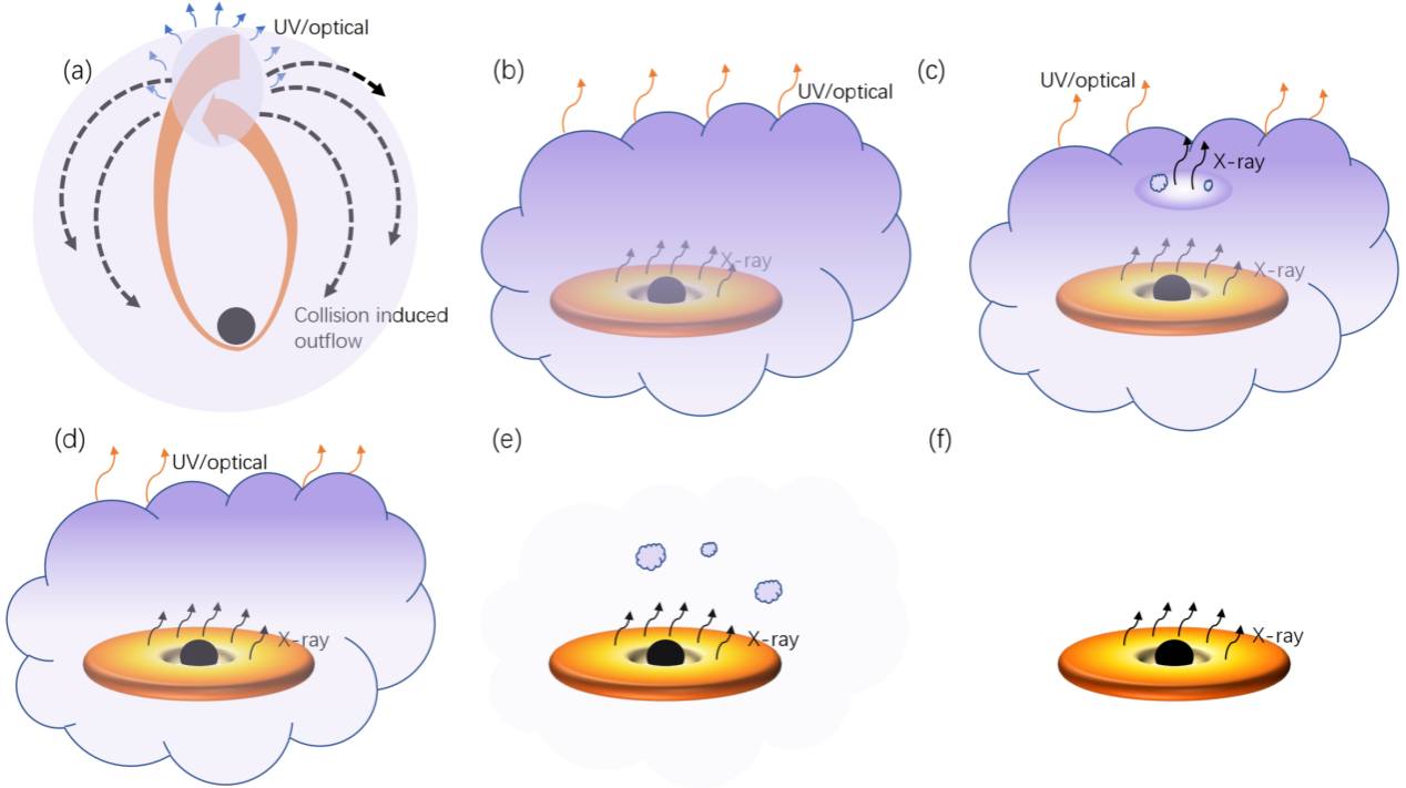 研究人员在第一种图像下,对X射线延迟于紫外光学辐射并出现“间歇性”辐射的现象进行了解释。研究团队认为,碎片流撞击除了产生“鼓包”之外,还产生了外流抛射物,这些物质把吸积盘内区遮蔽,并吸收了软X射线光子,通过再处理过程将其转化成紫外光学辐射。由于遮蔽物质分布不均匀,后期局部开始变得光学薄,使得X射线“泄漏”出来,又因为物质围绕黑洞运动,导致了“间歇性”特征(见图3)。