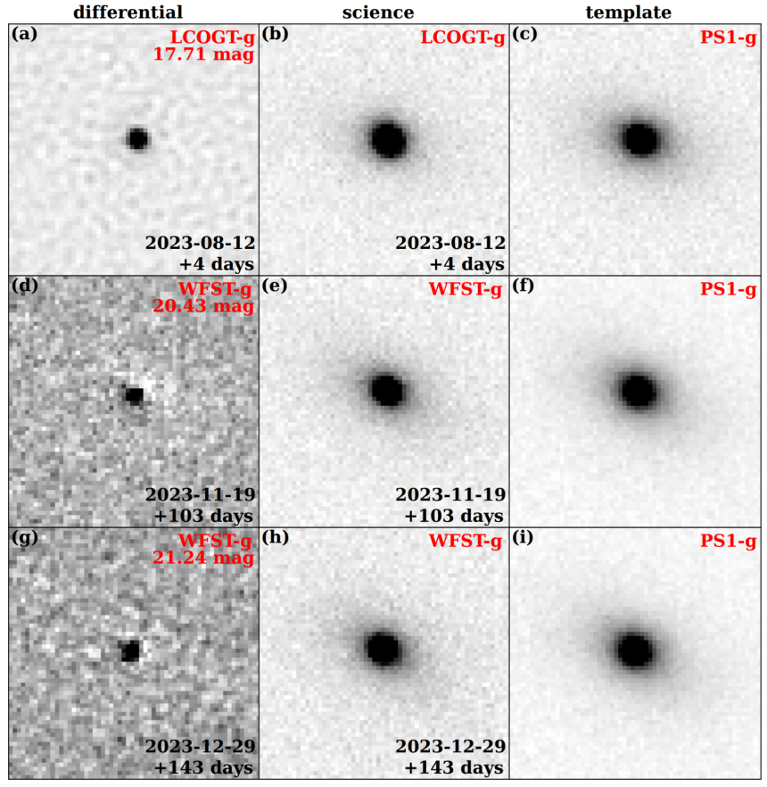 图 1 AT2023lli的光学图像。光学峰值附近使用了LCOGT进行观测,在后期变暗时使用了“墨子巡天望远镜”(WFST)对其进行监测,此时一般的望远镜已经很难观测到。