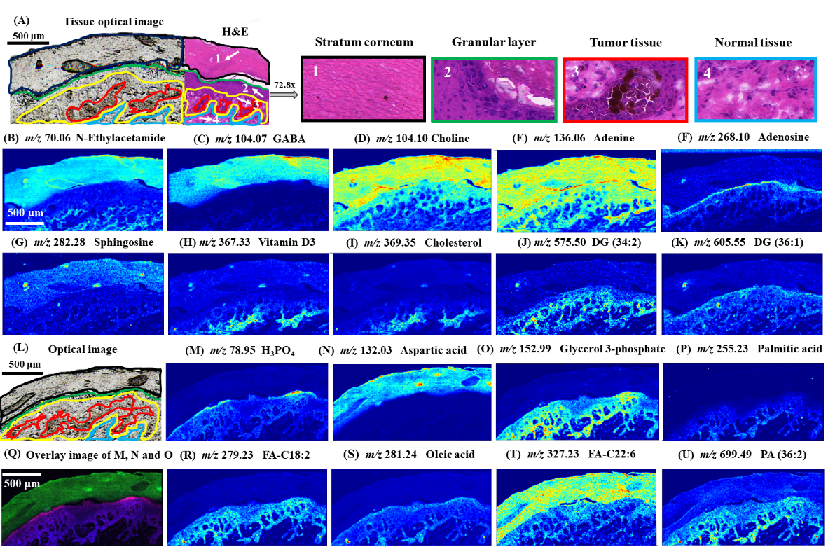 图3.黑素瘤组织的光学图及代表性化合物成像图,(A-K)正离子模式,(L-U)负离子模式。