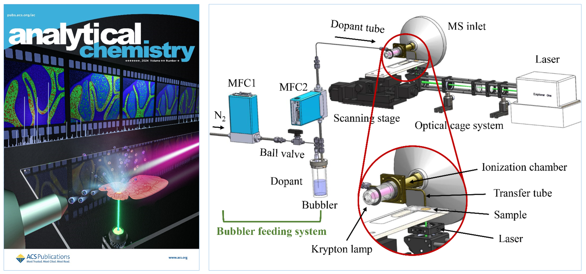 近日,中国科学技术大学国家同步辐射实验室潘洋教授、刘成园副教授课题组与生命科学学院田长麟教授合作,发展了常压透射式激光解吸/后光电离(t-AP-LDI/PI)的质谱成像新方法,以实现对生物组织中多种内源性化合物的原位可视化分析。研究成果以“Development of Transmission Ambient Pressure Laser Desorption Ionization/Postphotoionization Mass Spectrometry Imaging ”为题,于2024年3月25日以封面文章形式发表在分析化学领域知名期刊《Analytical Chemistry》(DOI:10.1021/acs.analchem.3c05605),该研究成果在课题组前期基于解吸电喷雾电离/后光电离基础上(Analytical Chemistry, 2022, 94, 15108;Analytical Chemistry, 2019, 91, 6616),进一步提升了成像空间分辨率和灵敏度。