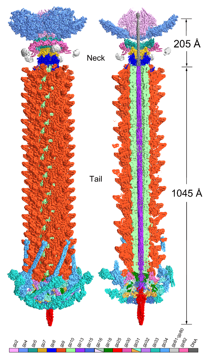 中国科学技术大学生命科学与医学部周丛照教授课题组,利用冷冻电镜单颗粒技术解析侵染模式蓝藻—鱼腥藻PCC 7120的肌尾噬藻体A-1(L)尾部机器的完整三维结构,结合一系列生化实验鉴定多个识别和水解宿主的关键功能模块,并基于结构信息重注释其基因组,揭示A-1(L)与其特异性宿主蓝藻相互作用的结构基础和分子机制,相关成果以“Structure of the intact tail machine of Anabaena myophage A-1(L)”为题于2024年3月26日在线发表在《Nature Communications》上。