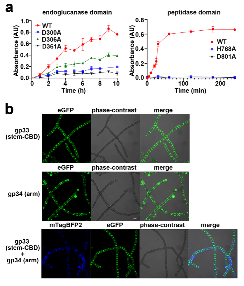 在前期报道A-1(L)正二十面体衣壳结构的基础上(JournalofVirology, 2021),研究人员进一步解析其三组分尾部机器的结构,包括颈部、尾部和附着的纤维(图一)。颈部由十二聚体门户蛋白、十五聚体接头蛋白和六聚体连接蛋白组成,外侧锚定着五根独立组装的串珠状颈部纤维。可收缩的尾部由24个尾管蛋白六元环和24个尾鞘蛋白六元环围绕着中央的卷尺蛋白组成。尾部末端榫卯结构的基板包含五个组分:尾尖蛋白-中心蛋白组成的中央三聚体核心,两种构象的六个栓塞蛋白亚基连接内部的三聚体核心和外部六重对称的楔形蛋白异源三聚体。六根长尾纤和六根短尾纤成对折叠,其中一端固定在基板上,另一端折回贴近衣壳。通过结构分析结合生化实验进一步鉴定基板中心蛋白的双重水解活性和两种尾纤的受体结合活性(图二)。此外,A-1(L)的完整结构帮助我们重注释了其基因组,将注释基因的比例提高至60%。该研究有助于我们深入理解噬藻体与宿主蓝藻相互作用的分子机制,为将来开发环境友好型底盘噬藻体奠定理论基础。