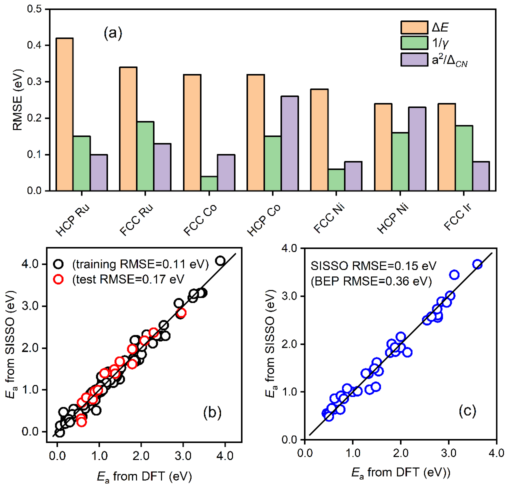 图2 (a)CO活化能垒与不同物理参数(反应热、表面能、拓扑配位不饱和度)之间的统计相关性;(b)机器学习模型的训练和测试准确度;(c)模型在新体系上的迁移性预测能力