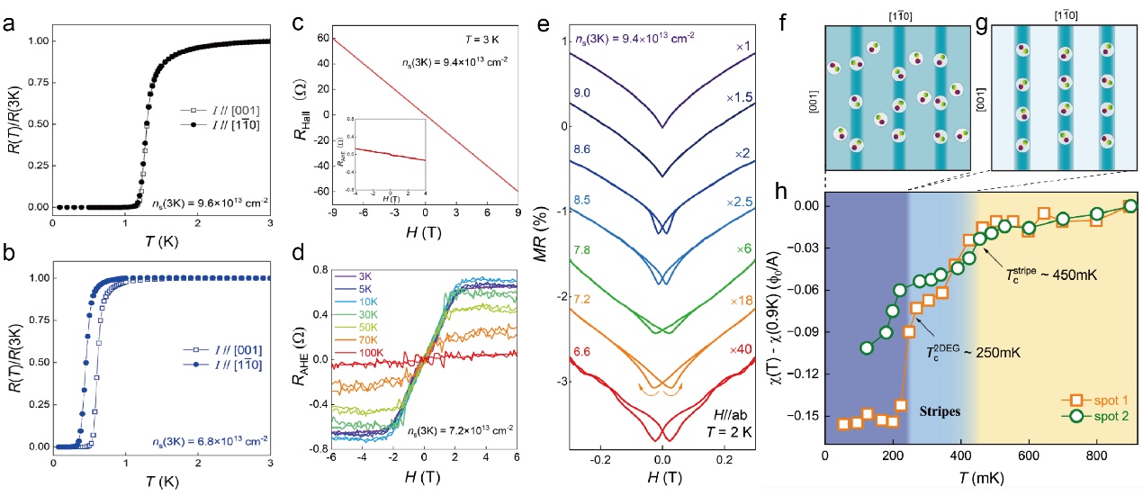近日,中国科学技术大学微尺度物质科学国家研究中心、物理学院、中科院强耦合量子材料物理重点实验室陈仙辉院士、项子霁教授研究团队在氧化物界面超导研究中取得重大进展。研究团队与清华大学、复旦大学的研究组合作,在铁磁性EuO和(110)取向的KTaO3(KTO)构成的氧化物异质结当中发现由铁磁近邻效应导致的具有特殊空间变化的超导态,即一维结构的超导条纹。这一结果为探索磁性和超导电性共存的非常规超导体系及其物理研究提供了新的途径。相关研究成果于3月11日以“Superconducting stripes induced by ferromagnetic proximity in an oxide heterostructure”为题发表在《Nature Physics》。
