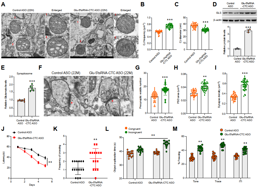 设计靶向该tRNA片段的反义寡核苷酸,并注射到衰老小鼠的大脑内,可以通过恢复谷氨酸能神经元中线粒体的蛋白翻译,内嵴结构,以及脑谷氨酸水平,显著减轻衰老小鼠学习记忆障碍。这些研究结果进一步支持谷氨酸tRNA片段是加速大脑衰老的重要风险因子,这也为减缓脑衰老相关的学习记忆功能障碍提供了新的治疗靶点。