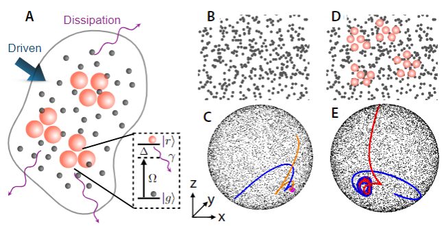 图1 物理示意图,(A)为开放系统,(B)为遍历性相的空间均匀分布,(C)为其相空间,不同初态将弛豫到同一固定点,发生热化。(D)为弱遍历性破缺相的空间分布,空间中里德堡原子由于相互作用发生聚集。(E)为其相应的相空间,相空间中出现非稳态解(极限环),对应于长时间振荡的末态。