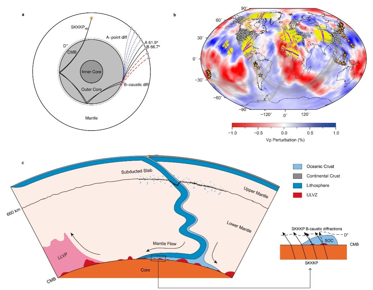 基于上述方法,研究团队不仅在太平洋和非洲下方的大型低速省周围发现了超低速区,还在之前未被充分研究的核幔边界高速异常区域内探测到了超低速区,包括中美洲、亚洲中西部、阿拉斯加和格陵兰岛等区域(图1b)。该研究结合已有地球动力学模拟结果,揭示了核幔边界高速异常区域内的超低速区形成机制:当俯冲板块进入下地幔时,其顶部洋壳可以和下覆板片逐渐分离并下沉到核幔边界,由于洋壳物质的熔点较周围地幔岩石更低,因此可能发生部分熔融形成超低速区(图1c)。