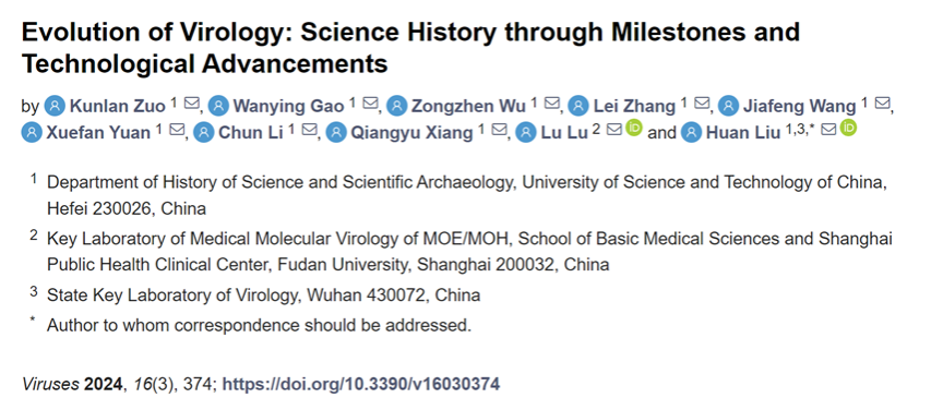 2024年2月29日,中国科学技术大学人文与社会科学学院科技史与科技考古系副教授刘欢团队在SCI国际学术期刊Viruses上发表了题为Evolution of Virology: Science History through Milestones and Technological Advancements的病毒学史论文,文章系统研究了病毒学演化及其在科学技术史上的重要里程碑与科技成就,首次提出病毒学发展的历史分期:微生物学时期、生物化学时期、遗传学时期和分子生物学时期,以通史的视野全景地呈现了不同历史时期和不同认知环境中的病毒学发展历程,揭示了病毒学的演化特征、内在动因与外在动力,及其要素之间的关系与影响,填补了病毒学科技史研究空白。
