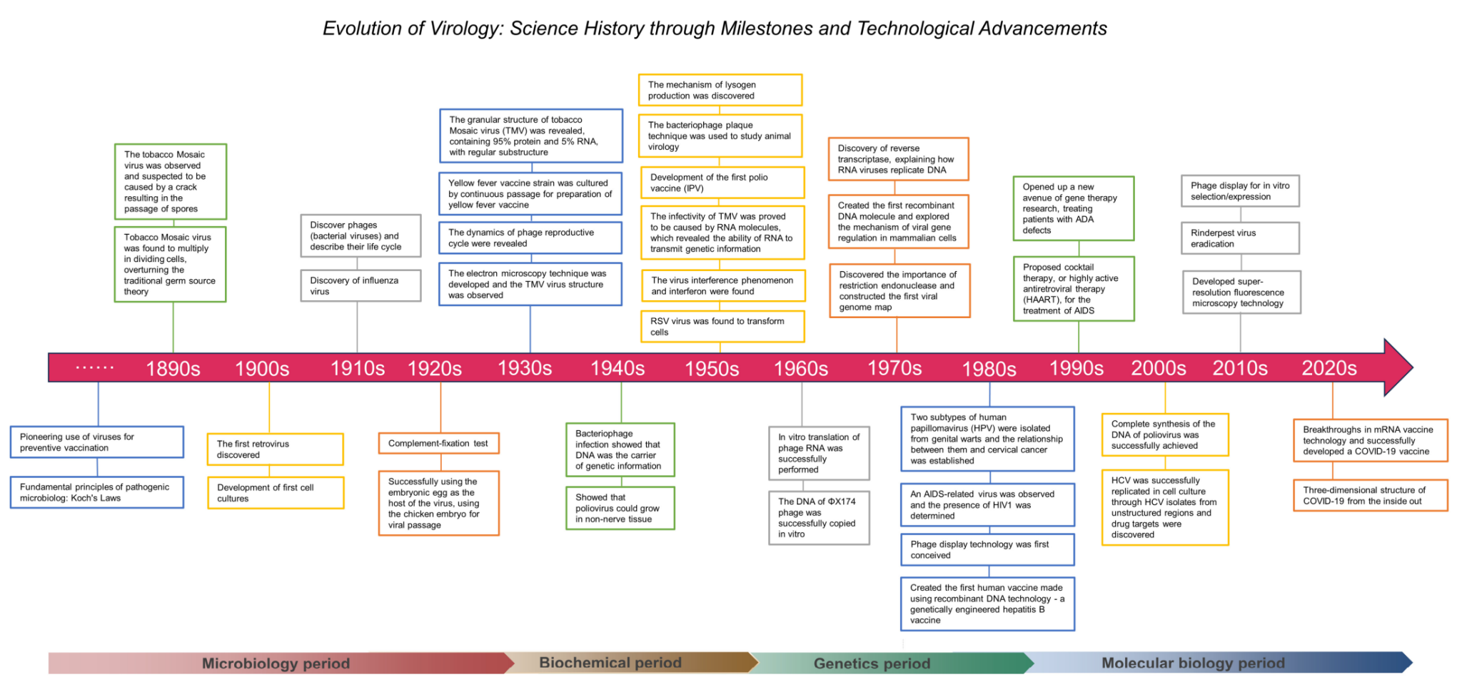 十九世纪末至今的病毒学科技史演化进程分期:微生物学时期、生物化学时期、遗传学时期和分子生物学时期