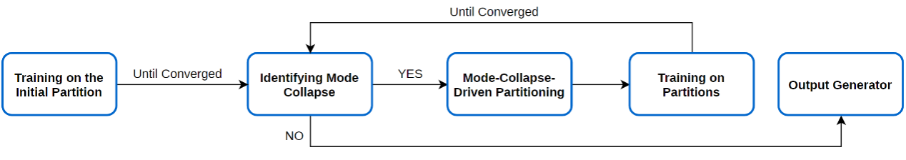 为了解决模式崩溃问题,我们提出了一个统一的框架,称为动态生成对抗网络(Dynamic GAN,DynGAN)。该方法通过对可观察的判别器输出设置相应阈值,检测出生成器无法生成的样本(崩溃样本),根据这些崩溃样本划分训练集,然后在这些划分上训练动态条件的生成模型。