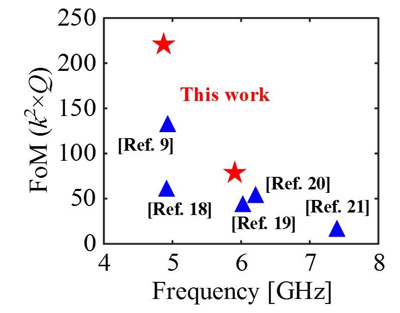 文中实现的一个X-SAW谐振器工作在5GHz,机电耦合系数高达34%,对应的谐振器优值(FoM =k2·Q)达到221(图1)。与近10年报道中4 GHz以上的SAW谐振器比较,工作在5GHz和6GHz的两个X-SAW谐振器FoM值均为世界最高(图2)。更重要的是,本工作成功发现了在同一个振动模态中可以耦合两个或多个不同剪切压电系数的可能性,并通过理论分析制定了实现这种耦合剪切模态的设计准则,为声学器件领域开辟了一条全新的研究路径,将在大带宽滤波器、宽带可调振荡器、高灵敏度传感器等诸多领域打开新的自由度,并对相关产业带来深远的影响。