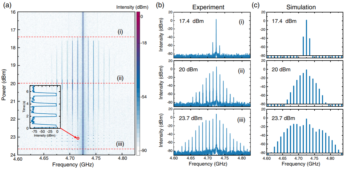 图2:a.磁振子频率梳随泵浦功率增加的演变;b-c.a图中不同演化阶段磁振子频率梳的实验与模拟光谱。
