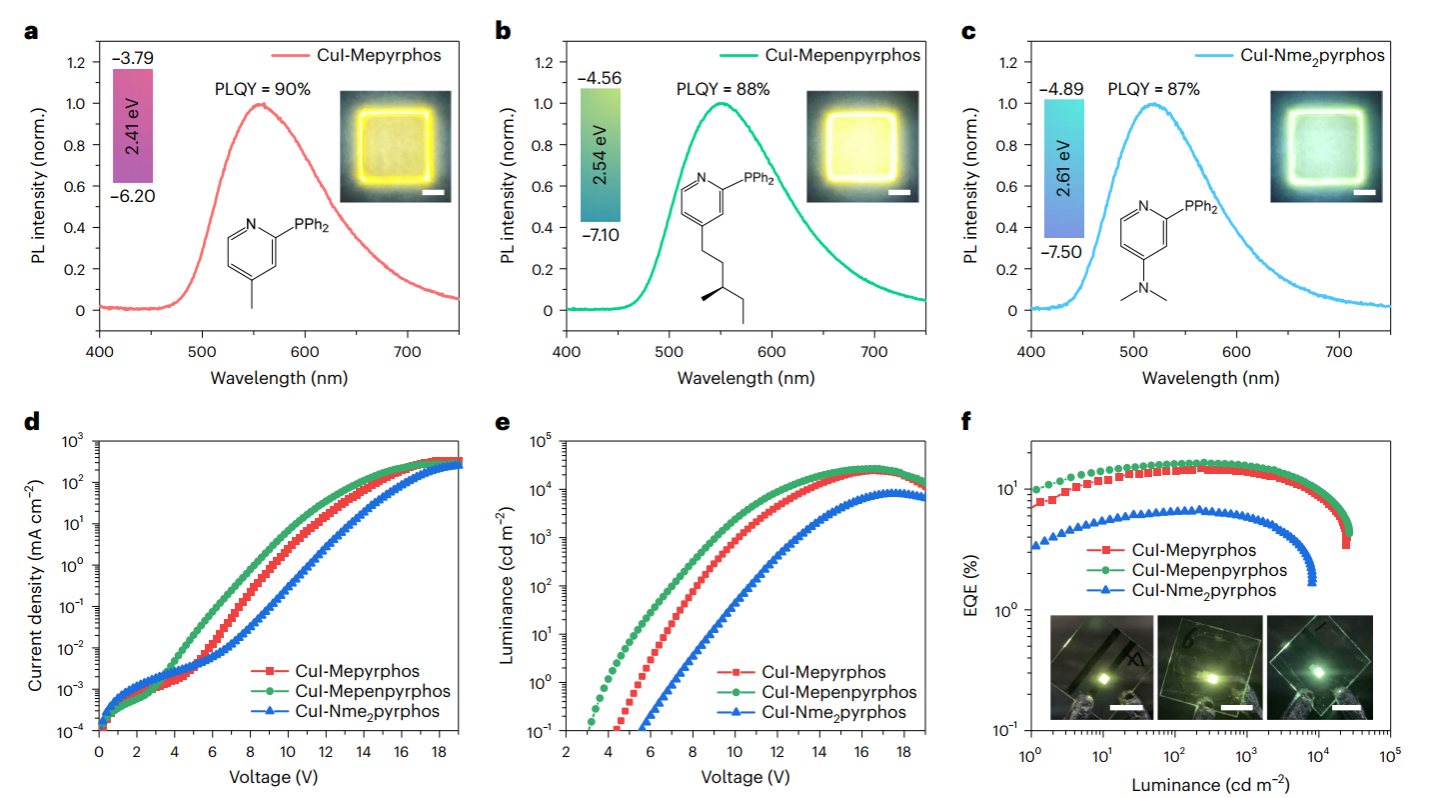 鉴于此,课题组基于铜碘杂化团簇体系设计和制备了一类可用于溶液加工的宽光谱发射杂化团簇并成功构建了高性能暖白光LED器件(图1)。通过同时引入氮膦螯合配体和高自由度的含膦增溶配体对铜碘团簇进行修饰,得到了兼具高发光效率和高溶解度的铜碘杂化团簇,该团簇在LED器件制备所使用的交叉溶剂N,N-二甲基甲酰胺(DMF)中表现出超过200mg/mL的高溶解度和良好的结构稳定性。使用铜碘团簇/DMF溶液进行旋涂制备得到的发光薄膜具有0.22 nm的低表面粗糙度和超过70%的高发光量子产率,将其直接作为发光层,能够通过正交溶剂路线制备低成本的暖白光LED器件。所得器件最大外量子效率达到19.1%,亮度超过40000 cd m-2,并且工作寿命超过232小时(T50@100 cd m-2)。与此同时,得益于团簇良好的溶液加工性能,研究成员通过大规模刮涂技术,构筑了工作面积为36 cm2的大尺寸溶液法LED器件,该器件展现出亮度接近60000 cd m-2的暖白光发射(图2)。此外,通过在氮膦螯合配体的氮杂环上修饰不同的供电子基团,课题组展示了一系列发光颜色可调的溶液法LED器件(图3)。该研究工作实现了基于铜碘杂化团簇材料的高效、高亮度暖白光LED器件的构筑,铜碘杂化团簇材料体系所具备的结构可拓展性以及光谱可调节性使其在低成本高性能LED面板等固态照明技术中展现出巨大的潜力。