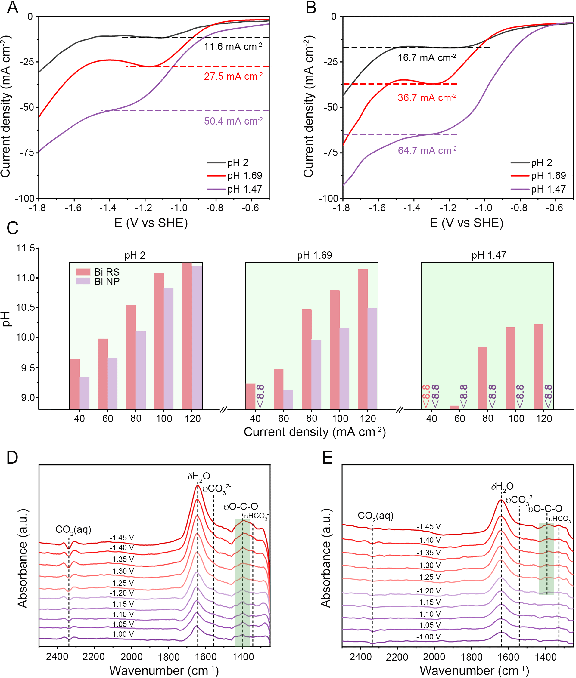 通过线性扫描伏安曲线测试,研究人员发现不同pH电解液中“储液池”催化剂的质子极限扩散电流密度均小于颗粒催化剂,说明“储液池”结构能抑制质子扩散至电极表面。原位拉曼光谱和红外吸收光谱测试结果发现“储液池”催化剂表面的pH均高于铋纳米颗粒,且能在更低的电位形成νO-C-O(HCOOH中间体)吸收带(图3)。这些结果进一步说明“储液池”结构在电极表面营造了局域强碱性微环境,抑制了析氢竞争反应,实现了酸性介质中二氧化碳到甲酸的高效转化。
