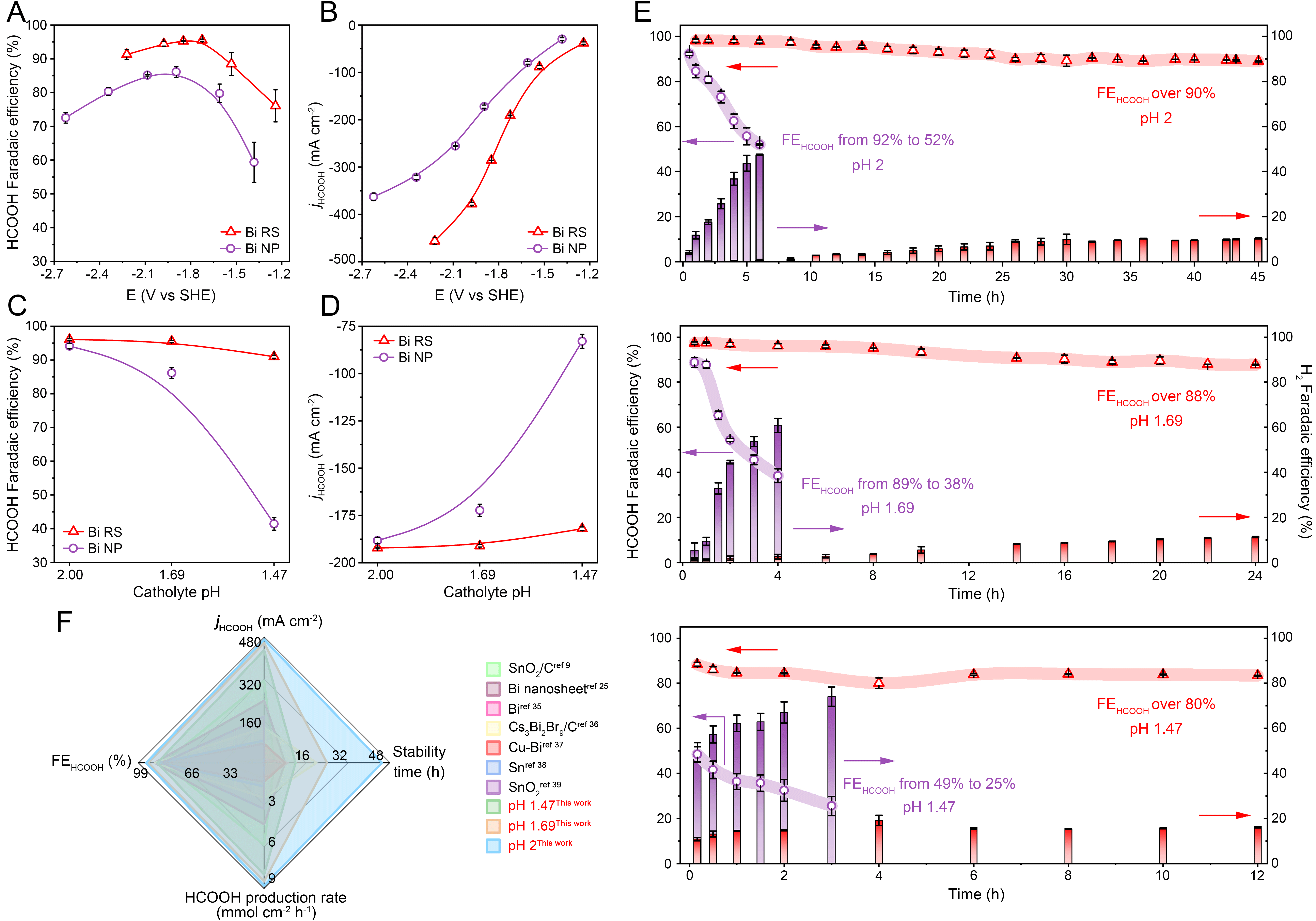 近日,中国科学技术大学高敏锐教授和唐凯斌教授课题组合作,研制了一种具有“储液池”结构的片状铋基催化剂。在酸性环境中,该结构一方面有效抑制钾离子和原位生成的氢氧根向体相电解液扩散,另一方面也限制了体相质子向催化剂表面的内扩散,从而在酸性环境中营造了局域强碱微环境,抑制了析氢副反应,促使二氧化碳向甲酸高效转化。相关成果近日以“Efficient and stable acidic CO2electrolysis to formic acid by a reservoir structure design”为题发表于《美国国家科学院院刊》上(Proc. Natl. Acad. Sci.,2023,120, e2312876120)。论文的共同第一作者为贝博ballbet艾弗森博士研究生池丽萍和牛壮壮。